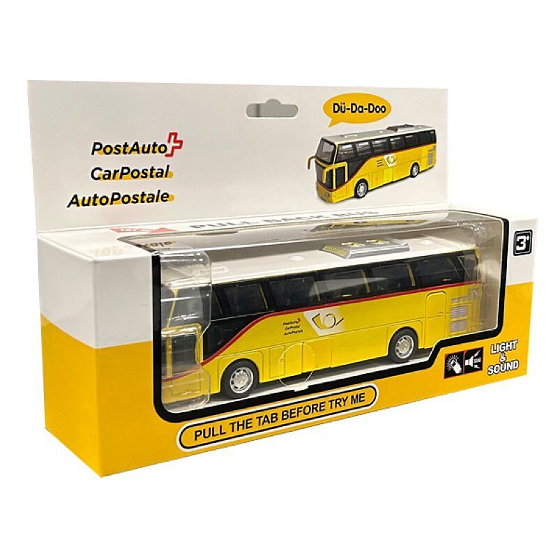 Postauto Bus mit Licht und Sound Dü-Da-Doo, Rückzugfunktion, aus Spritzguss, in Fensterbox.