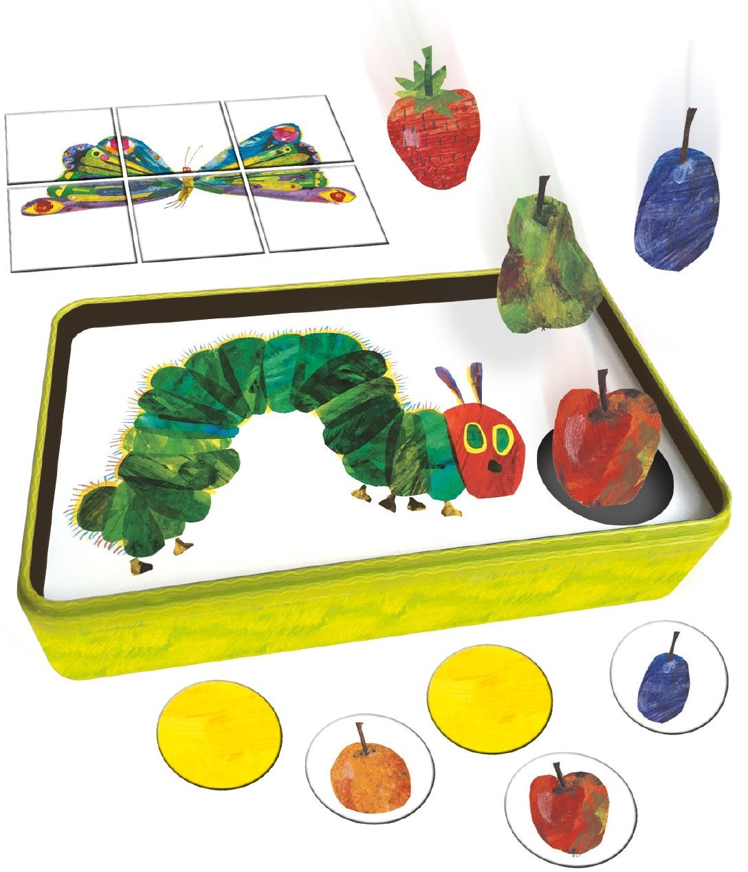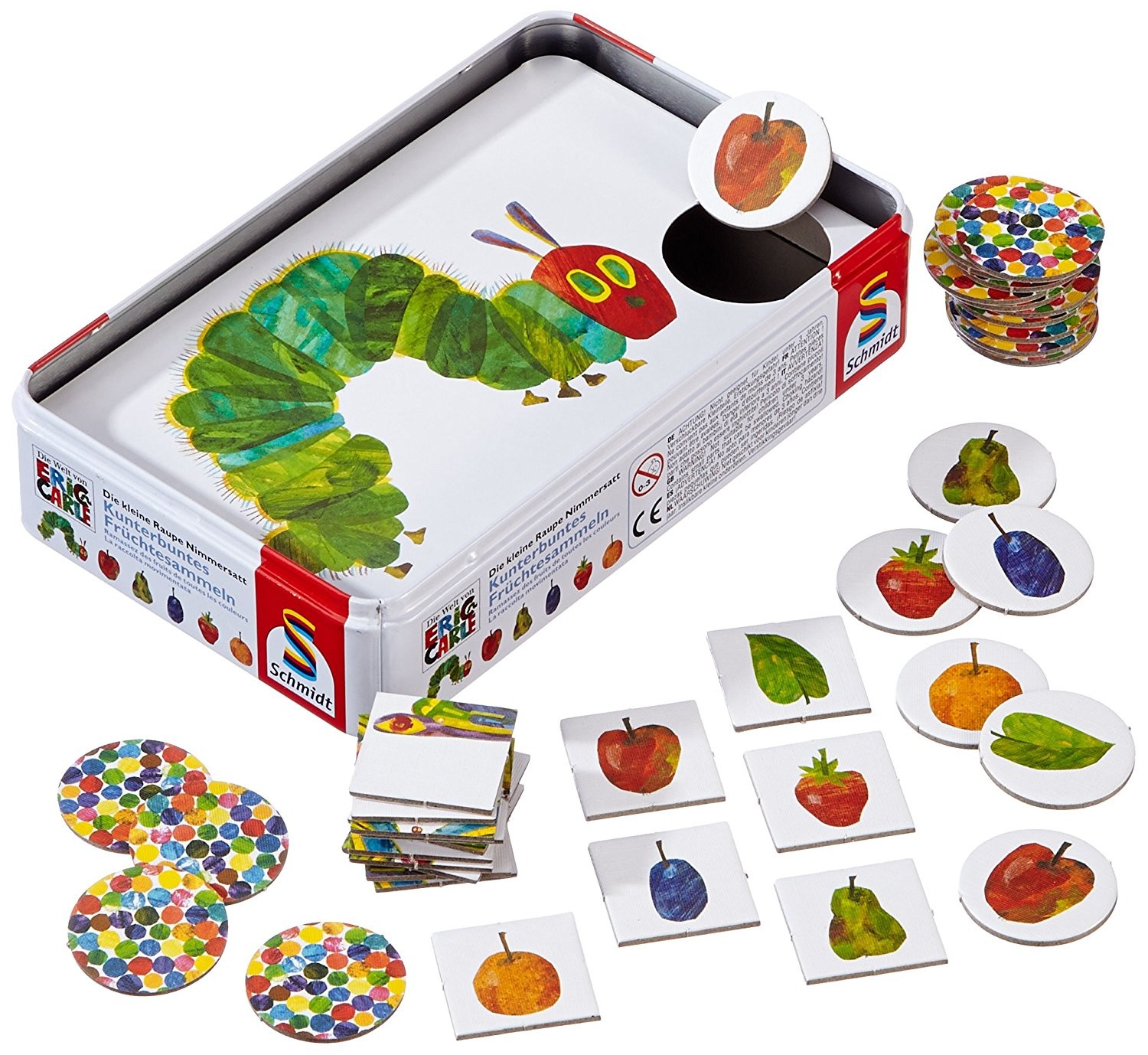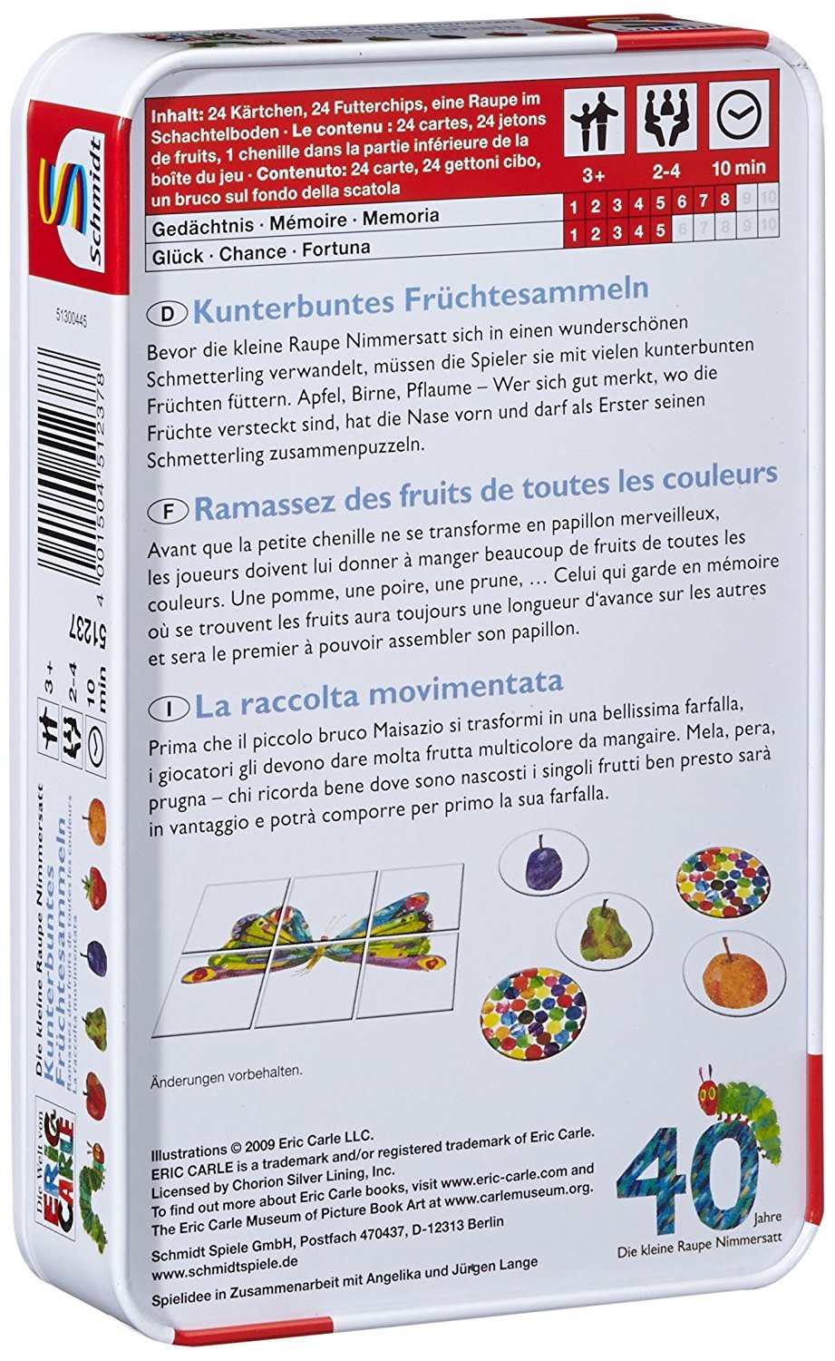 Bevor die kleine Raupe Nimmersatt sich in einen wunderschönen Schmetterling verwandelt, müssen die Spieler sie mit vielen kunterbunten Früchten füttern. Apfel, Birne, Pflaume - wer sich gut merkt, wo die Früchte versteckt sind, hat die Nase vorn und darf als E...