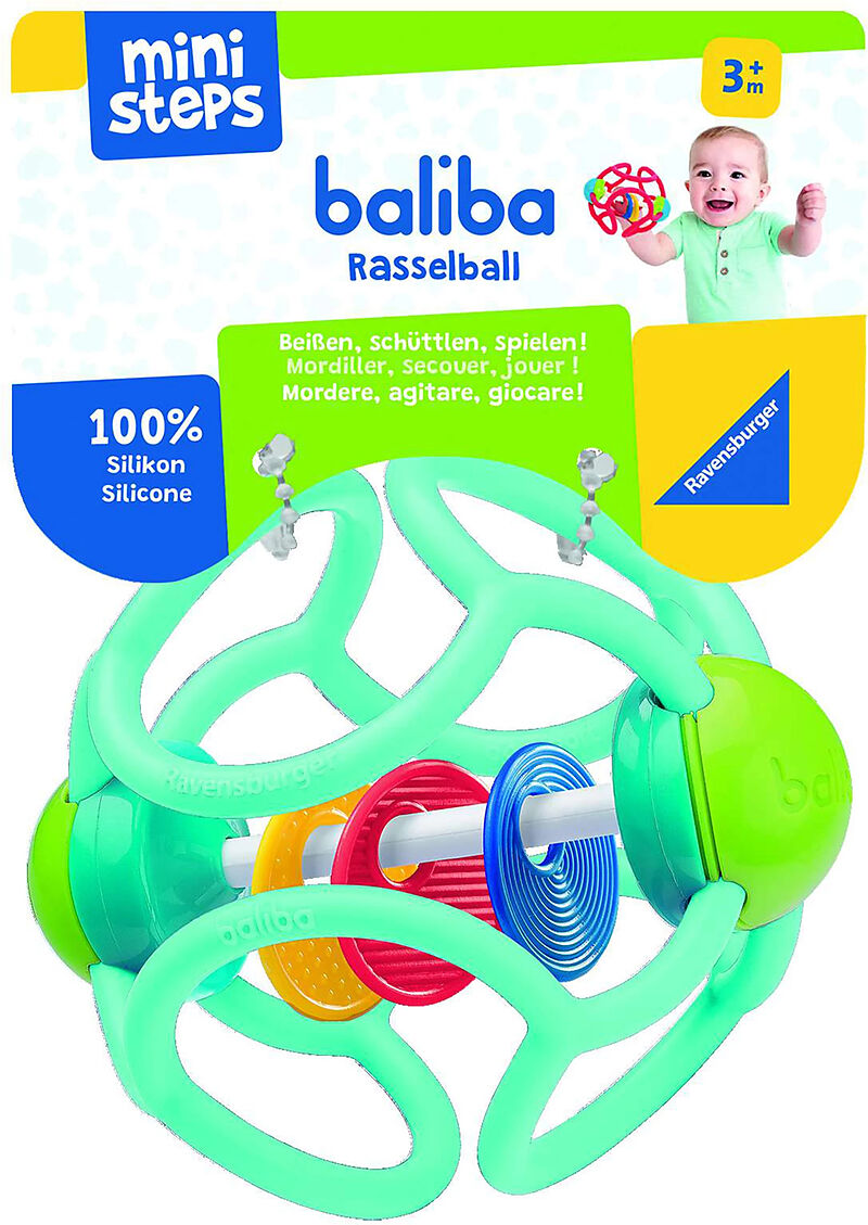 Ravensburger 04152 baliba Rasselball Das bunte Babyspielzeug mit seiner offenen Struktur können schon die Allerkleinsten greifen und zum Mund führen. Drei bunte, bewegliche Klapperscheiben animieren immer wieder zum Spielen, Schütteln und Werfen. So bleibt der...