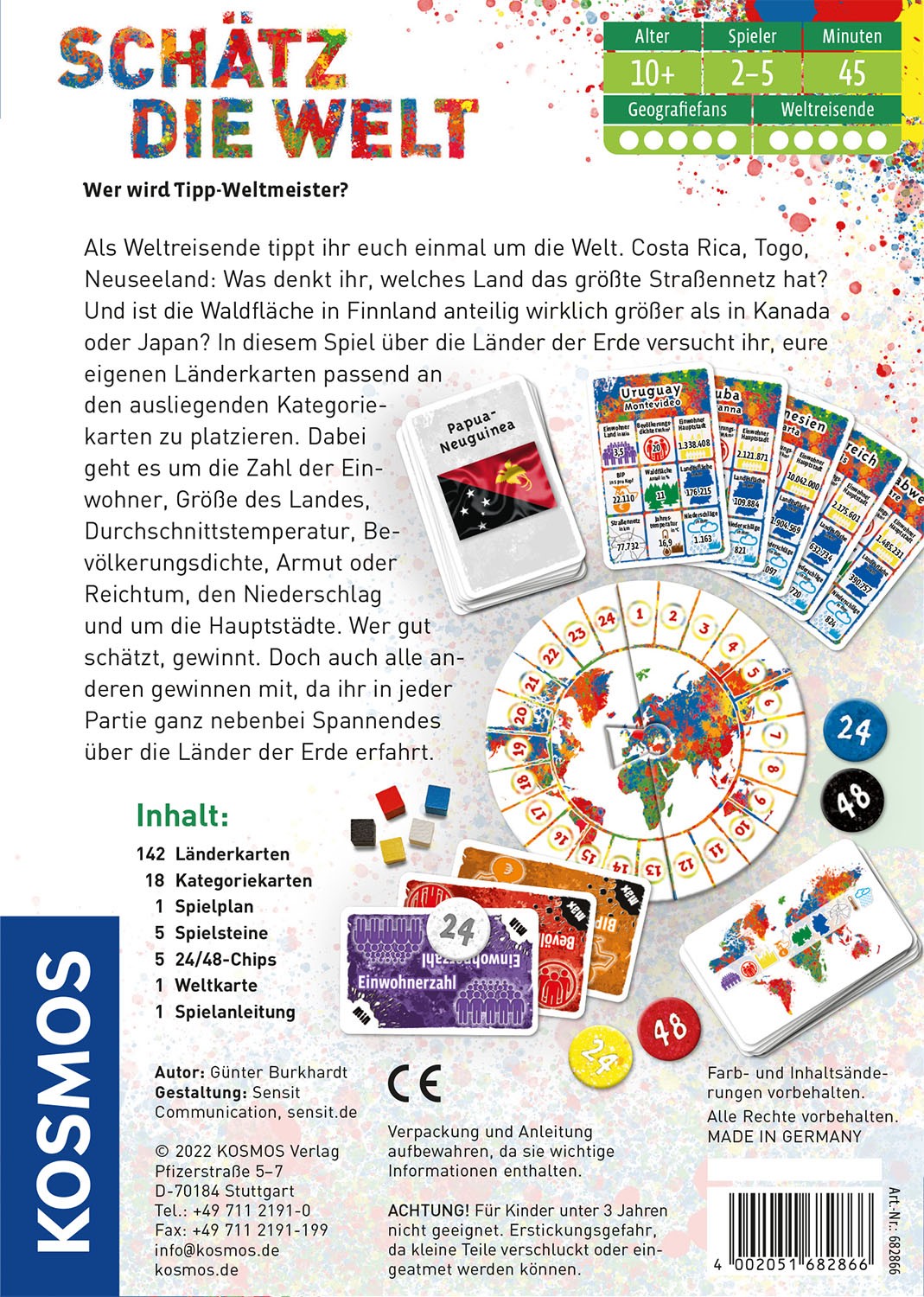 Schätzen, tippen, staunen: Spielerisch durch die Welt reisen. Lehrreiches, kurzweiliges Geografiespiel. Waldfläche, Niederschlag, Straßennetz: Raten und durch die Welt reisen! Wo leben besonders viele Menschen? Ist Neuseeland größer als Panama? Und wo gibt es ...