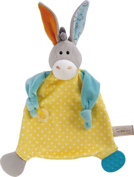Schmusetuch Esel mit Beißring und Schnullerbefestigung Das Schmusetuch Esel mit seinen langen Eselsohren ist ein unverzichtbarer Begleiter für Babys und Kleinkinder. Das super softe Material und die geknoteten Arme des MyFirstNICI Schmusetuchs, laden zum Greif...