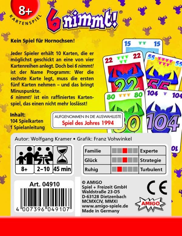 Amigo Sechs Nimmt! Ein raffiniertes Kartenspiel das einen nicht mehr losläßt. für 2 bis 10 Spieler ab 10 Jahren.
