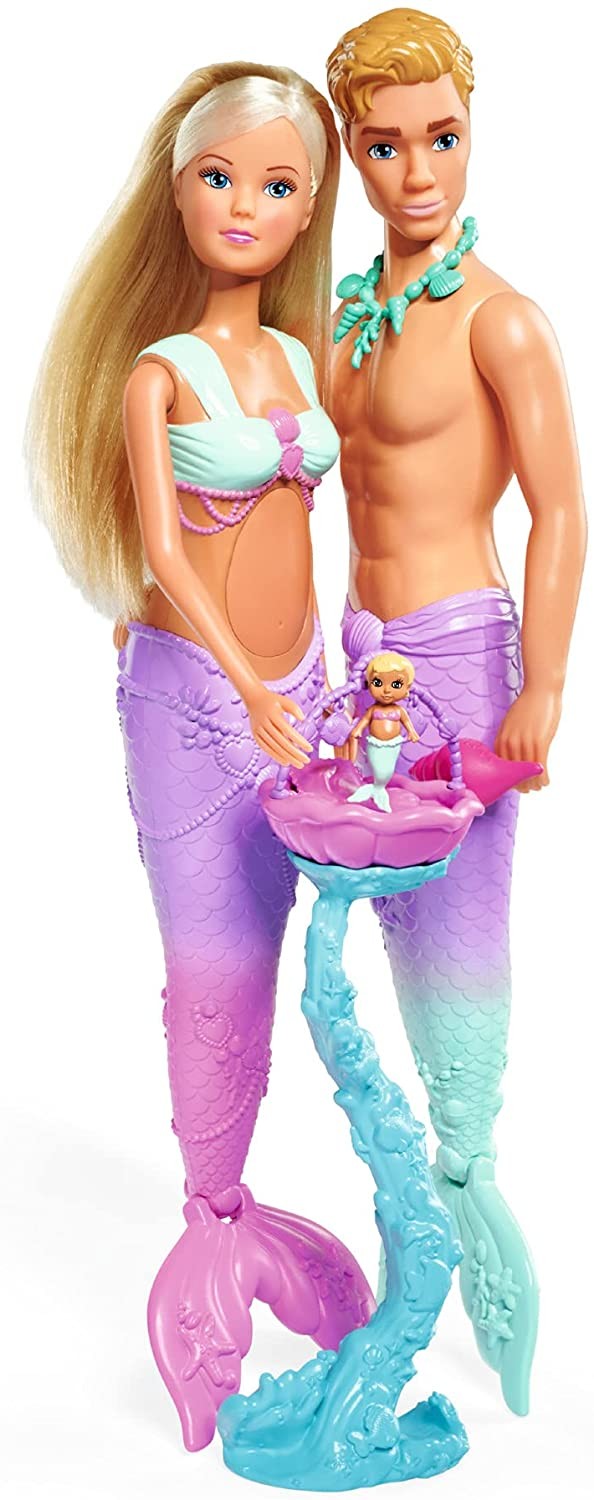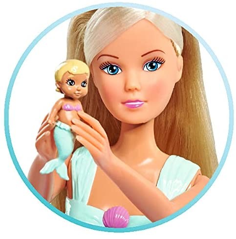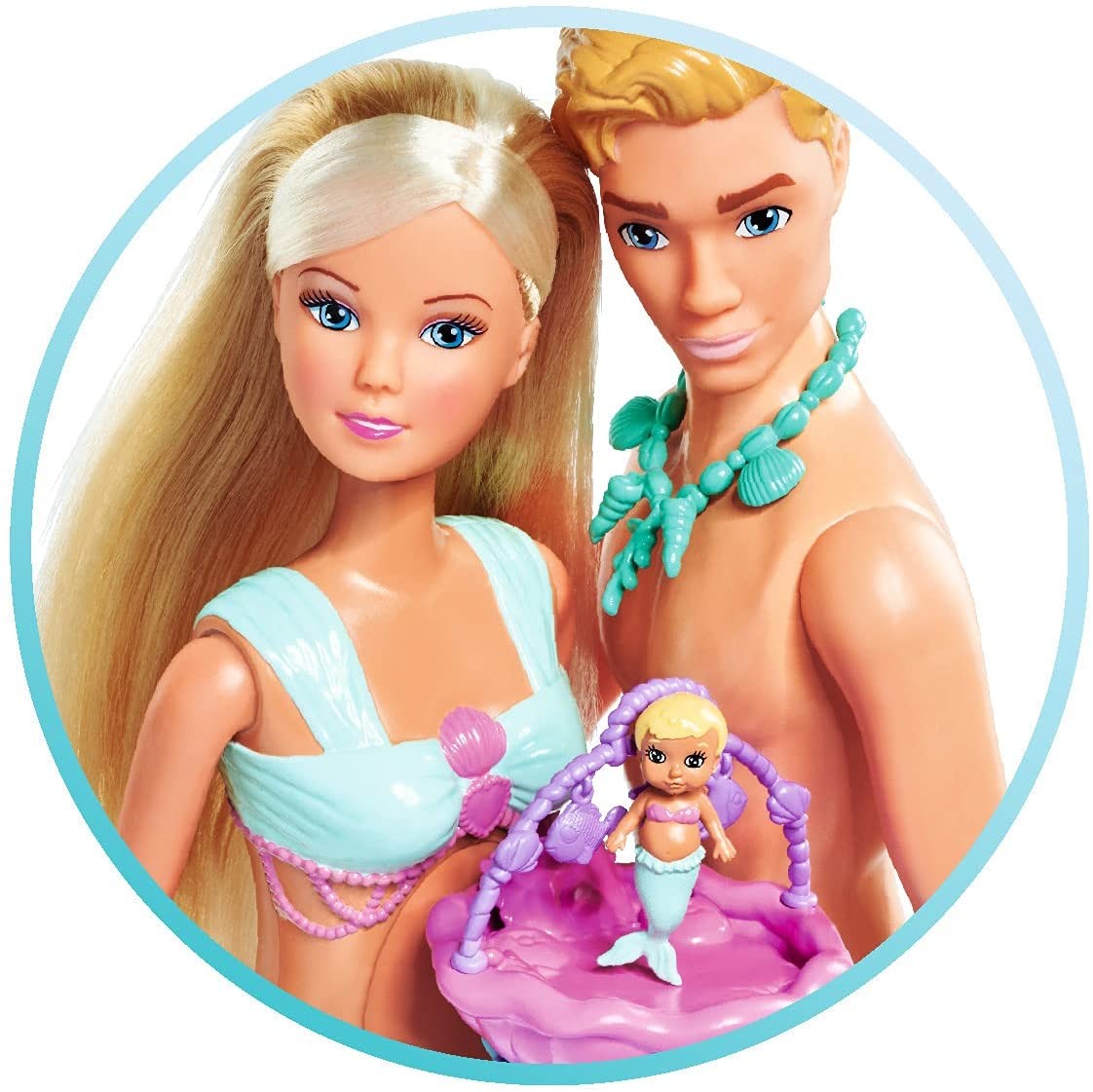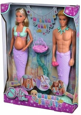 Setinhalt: Ankleidepuppen 29 cm, Steffi Love als schwangere Meerjungfrau und Kevin als Meerjungmann. Ein süßes Baby mit Kinderbett und Zubehör. Steffi verzaubert als schwangere Meerjungfrau, deren Baby leicht aus dem Bauch entnommen und somit geboren werden ka...