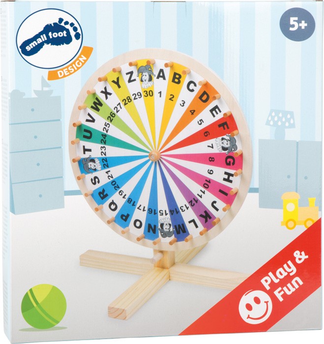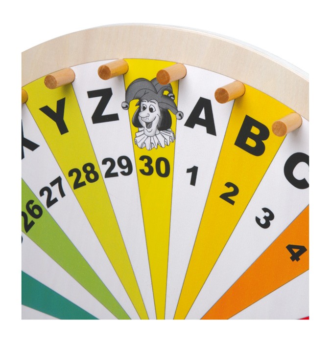 Ein tolles Zubehör für Lotteriespiele, Wortspiele oder erdachte Spiele ist dieses Glücksrad mit Ziffern von 1 bis 30, Buchstaben von A bis Z und vier Jokern! Auf dem standsicheren Massivholzständer kann das Rad sich gut drehen und die einzelnen Felder sind mit...
