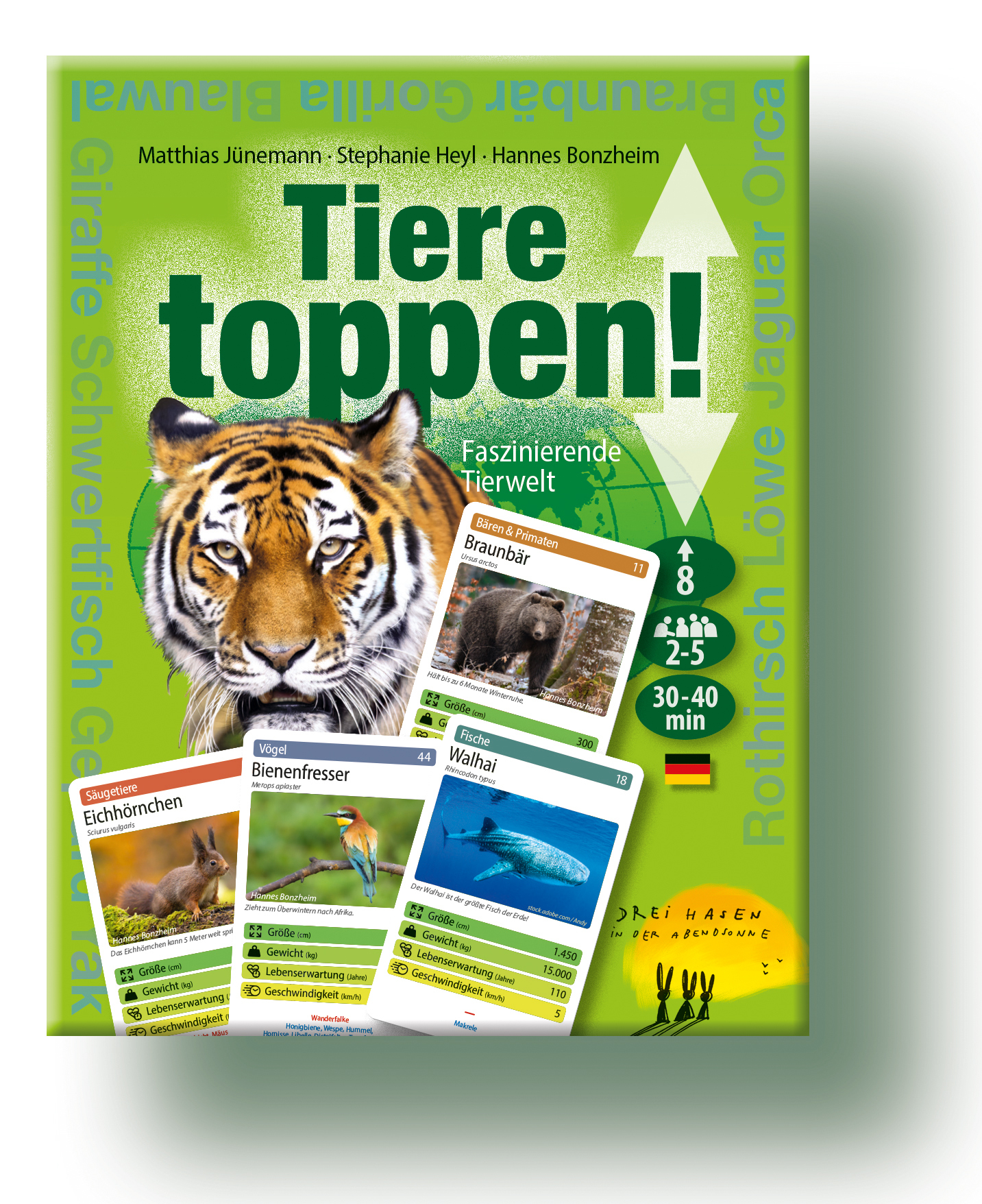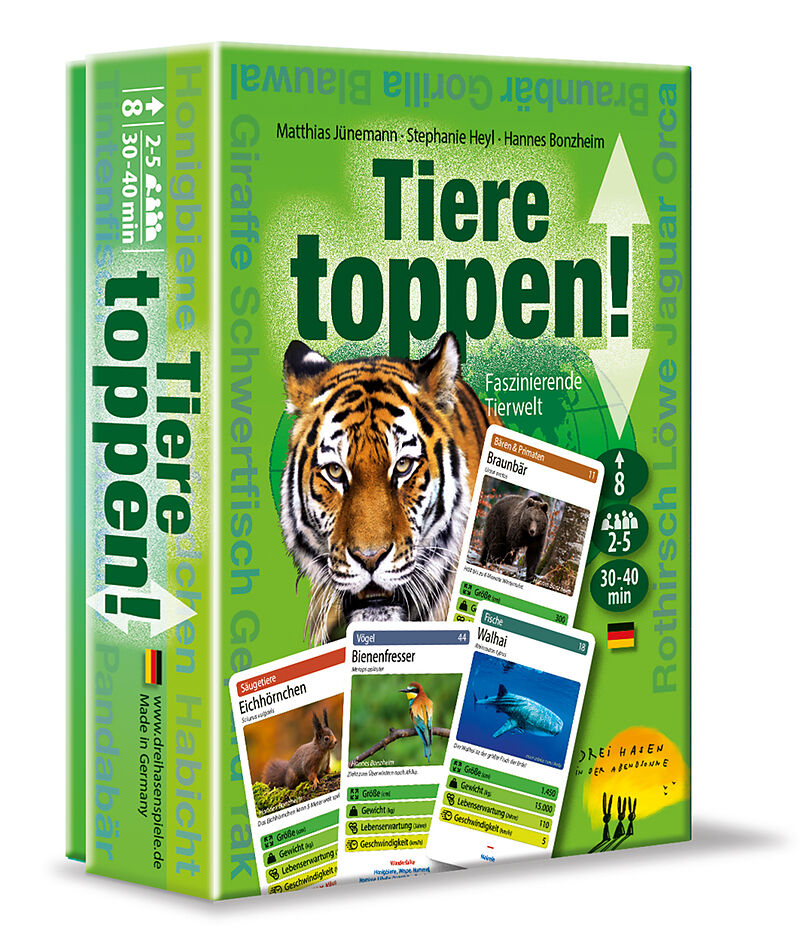 TIERE TOPPEN - das NEUE aus der "Toppen-Reihe" Spielziel ist es, durch kluges Zuordnen von Tierkarten möglichst viele Stiche zu machen. Doch Stiche allein sind nicht genug. Wenn Du gewinnen willst, musst Du sie so geschickt aufteilen und die Gruppens...