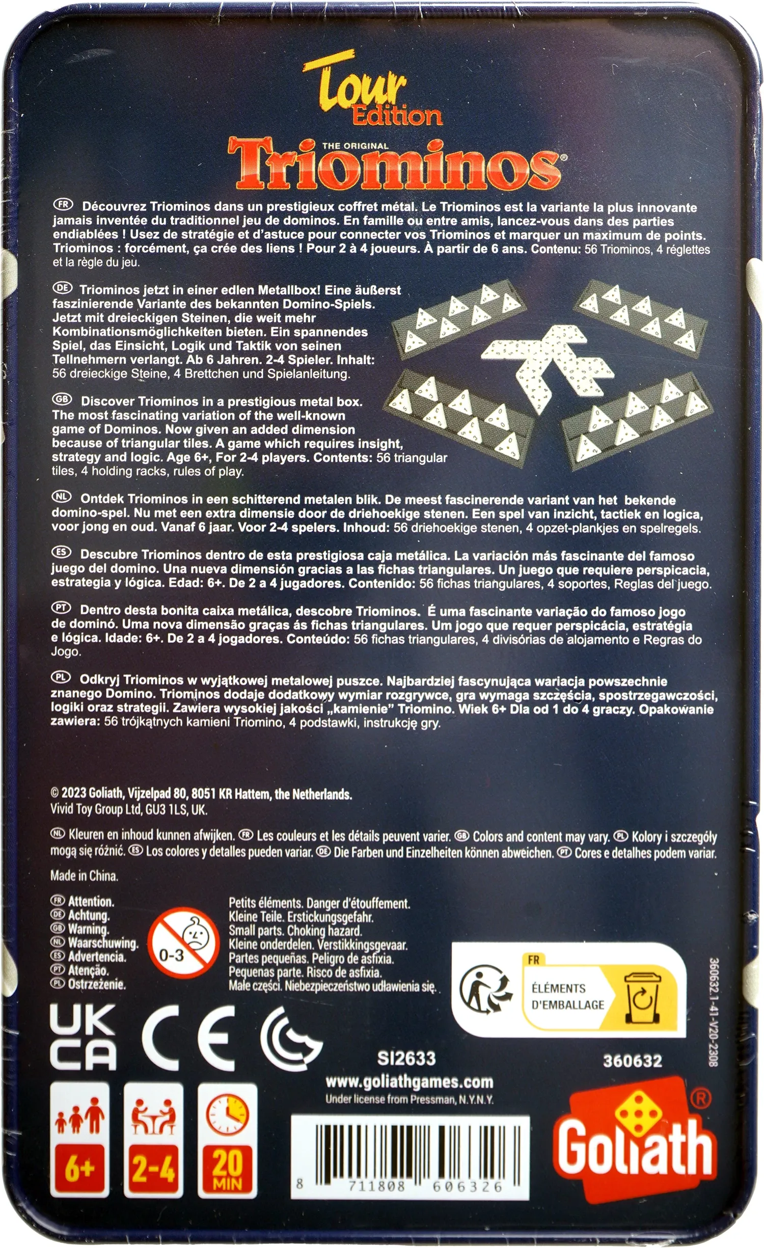 Goliaht 60632 Triominos Tour Edition Triominos ist das Legespiel mit dreieckigen Spielsteinen für die ganze Familie. Es funktioniert nach dem gleichen Prinzip wie Domino, punktet aber mit weitaus raffinierteren Anlegemöglichkeiten. Spannend wird es mit den ver...