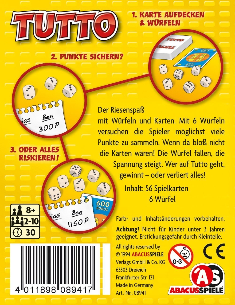 Tutto Stimmung ist angesagt. Mit sechs Würfeln verursachen die Spieler möglichst viele Punkte zu erreichen. Wenn da bloß nicht die Karten wären! Manchmal lockt ein satter Bonus, doch oft müssen auch hart erkämpfte Punkte wieder gestrichen werden. Die Würfel fa...