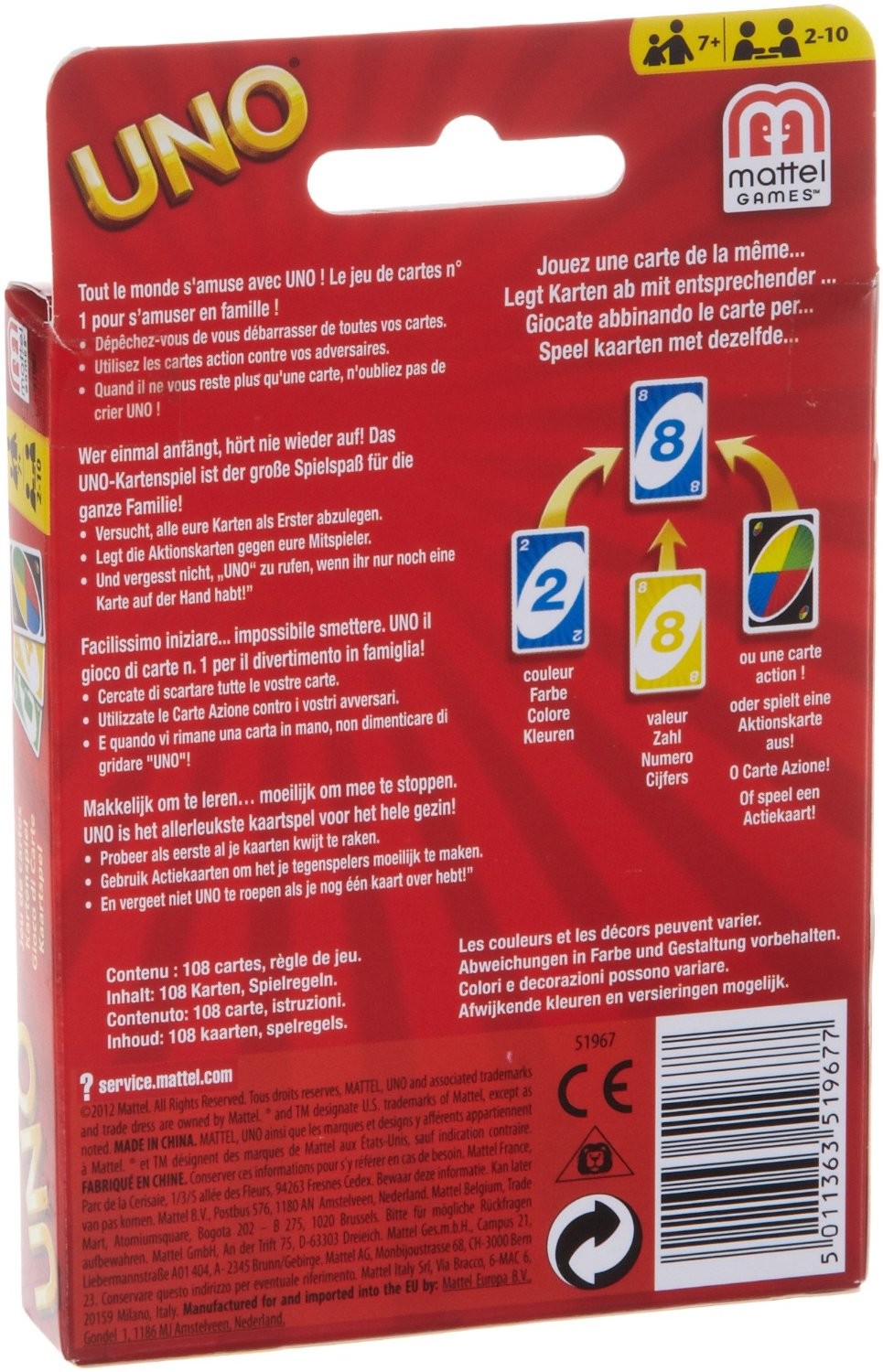 Der Klassiker unter den Spielen. Das weltweit beliebteste Familienkartenspiel. Ziel des Spiels ist es, als Erster alle eigenen Karten nach Zahl und Farbe abzulegen. Vier verschiedene Aktionskarten: "Zieh 2", "Zieh 4", "Aussetzen" und "Retour" sorgen im Spielve...