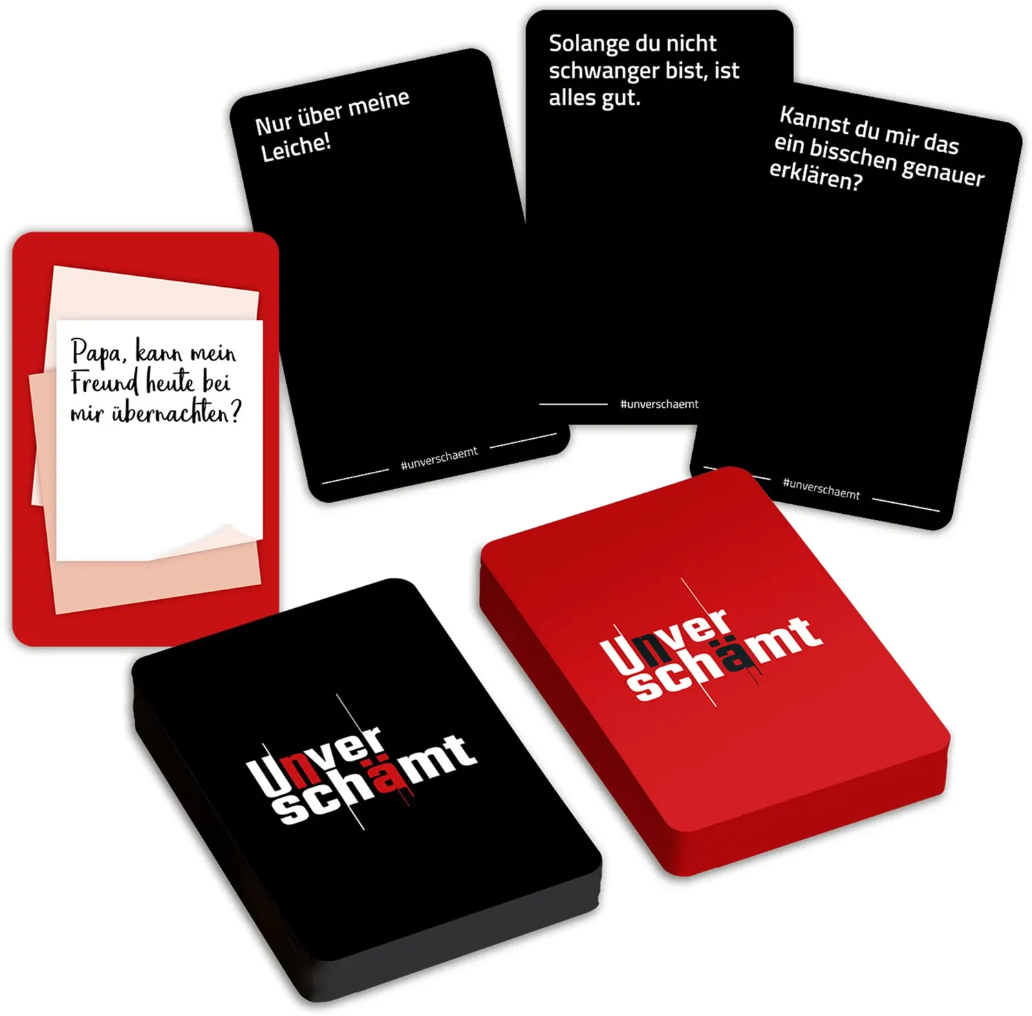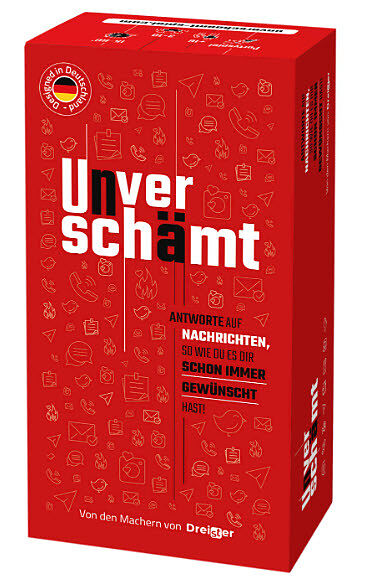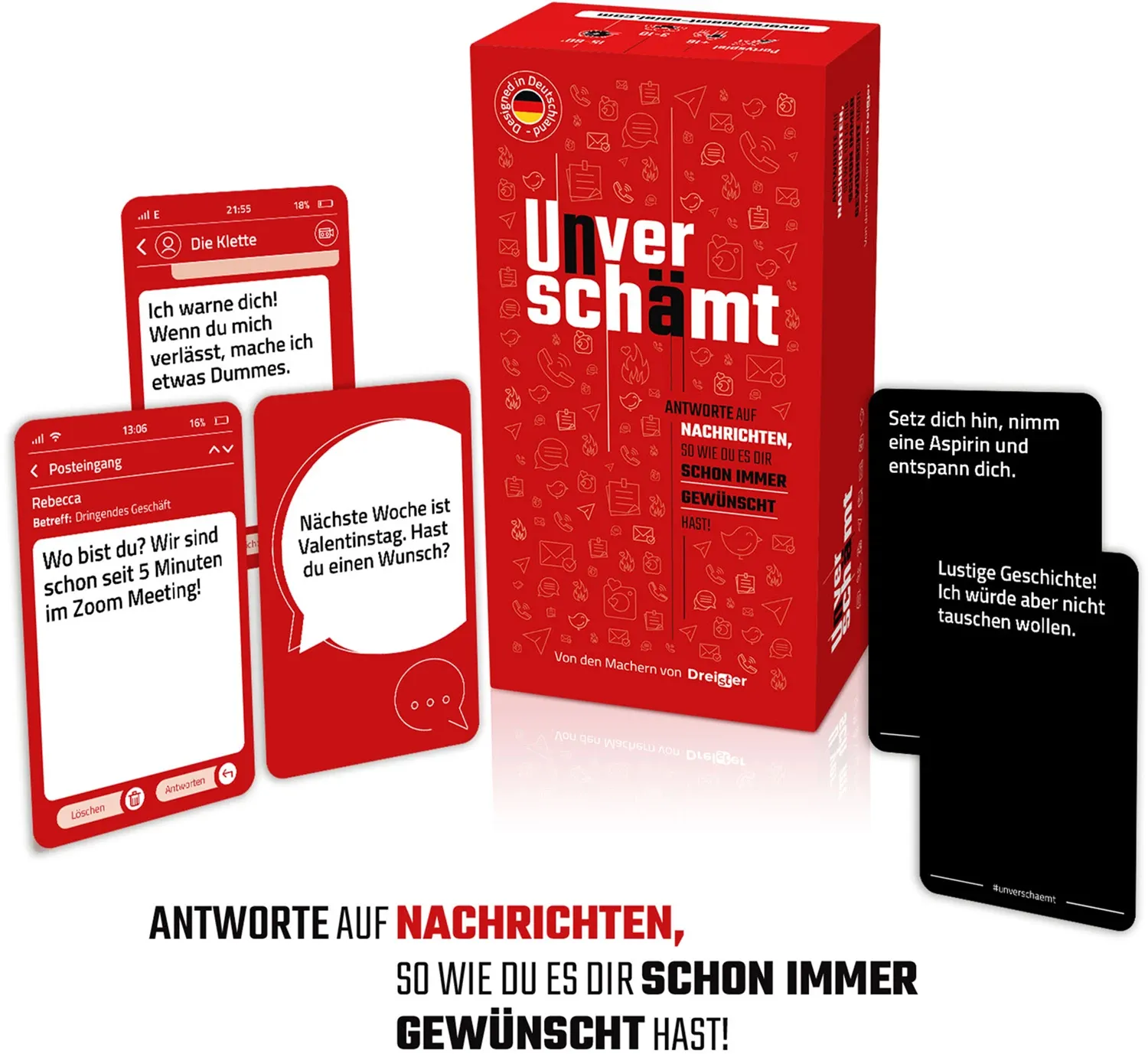Antworte auf SMS, WhatsApp oder Tinder Nachrichten wie es dir gefa¨llt! Lese die Nachricht auf deiner Karte laut vor. Alle anderen Spieler wa¨hlen nun eine mo¨glichst unverscha¨mte Reaktion aus ihren Antwortkarten aus. Du entscheidest, wer gewinnt.