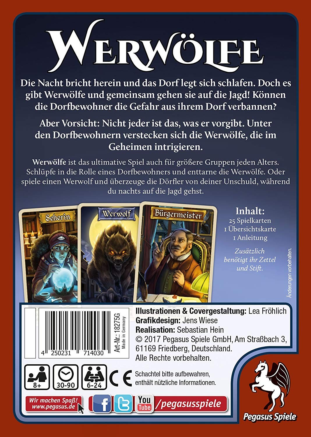 Pegasus Werwölfe Neuausgabe Werwölfe ist das ultimative Spiel auch für größere Gruppen jeden Alters. Schlüpfe in die Rolle eines Dorfbewohners und enttarne die Werwölfe. Oder spiele einen Werwolf und überzeuge die Dörfler von deiner Unschuld, während du nachts...
